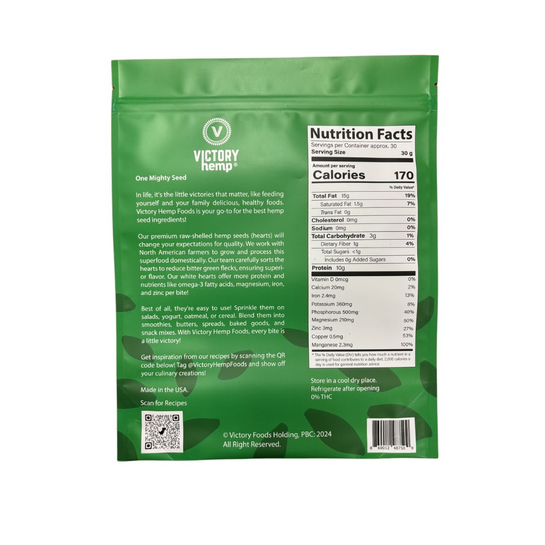 Our premium raw-shelled hemp seeds (hearts) will change your expectations for quality. We work with North American farmers to grow and process this superfood domestically. Our team carefully sorts the hearts to reduce bitter green flecks, ensuring superior flavor. Our white hearts offer more protein and nutrients like omega-3 fatty acids, magnesium, iron, and zinc per bite! Check our recipes page for culinary inspiration or just eat them out of the bag!